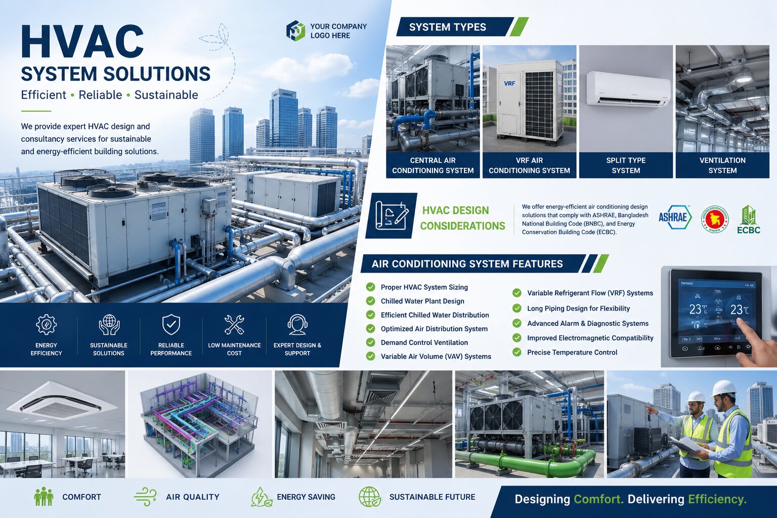 We offer energy-efficient air conditioning design solutions that comply with ASHRAE, Bangladesh National Building Code (BNBC), and Energy Conservation Building Code (ECBC).